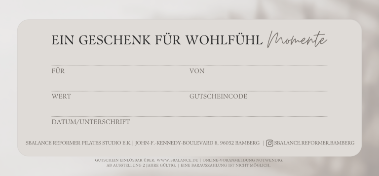 Bitte beachte: Gutscheine müssen online gekauft werden und auf Wunsch kann eine Gutscheinkarte zusätzlich in meinem Studio abgeholt werden - nach Verfügbarkeit gibt es auch passende Klebesticker (z.B. Weihnachten, Geburtstag usw.). Du kannst den Wert des Gutscheins individuell bestimmen. Gutscheine können für alle Classes online eingelöst werden.